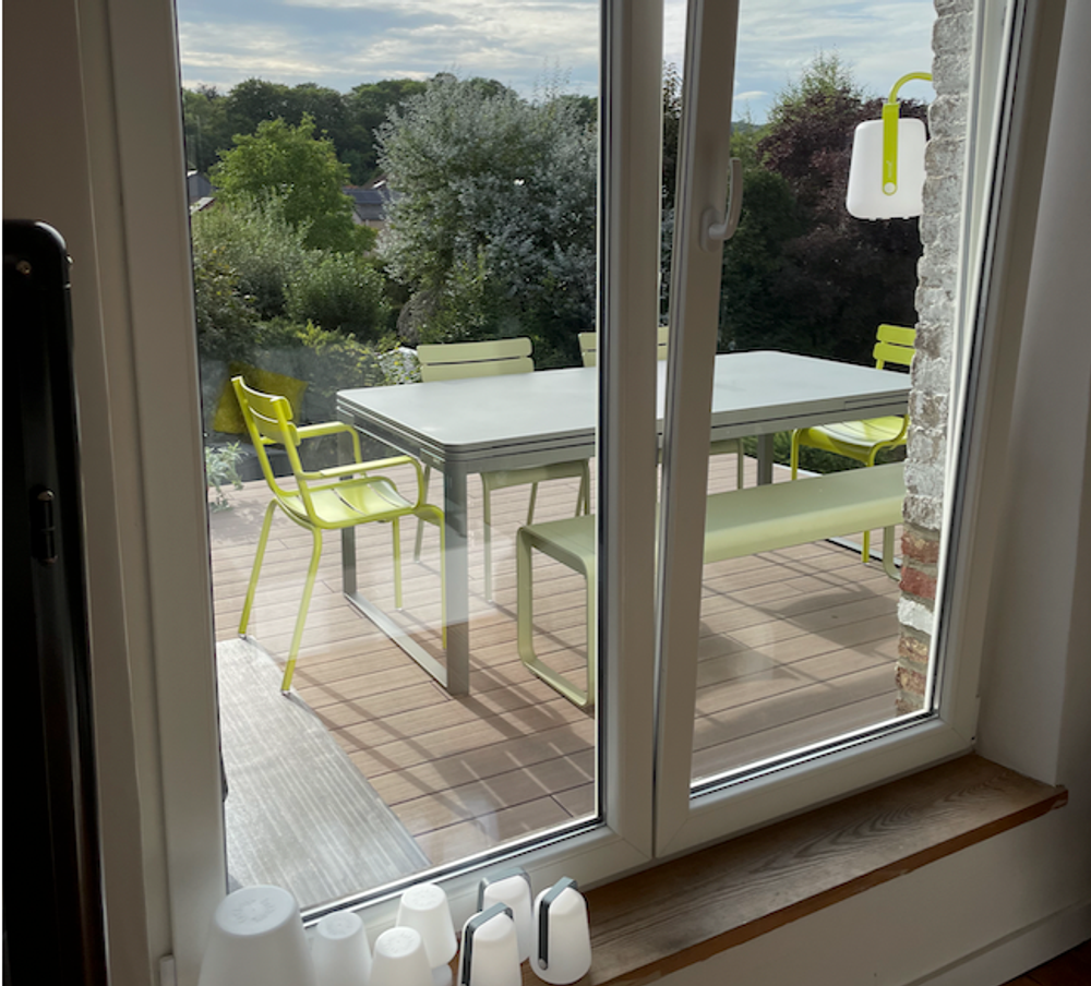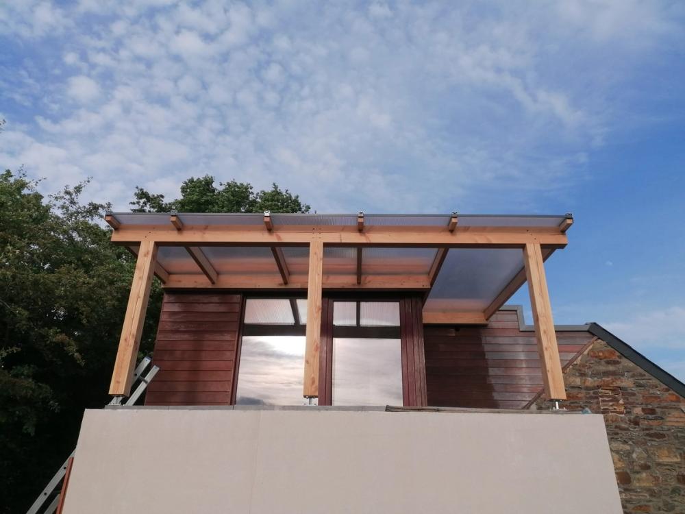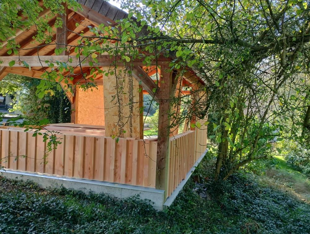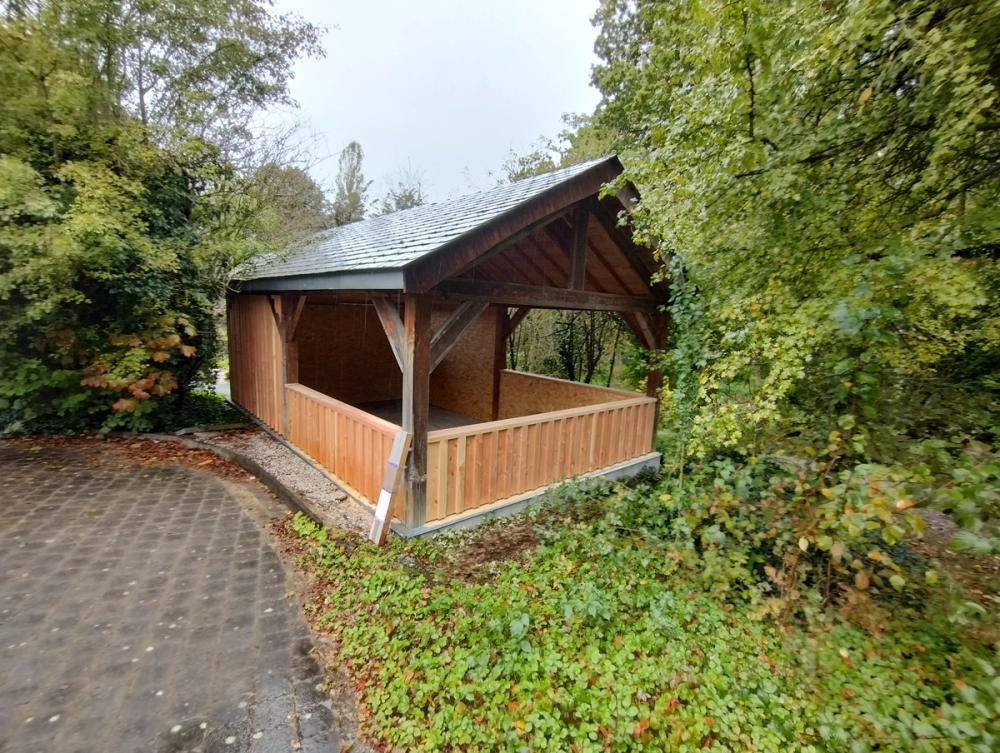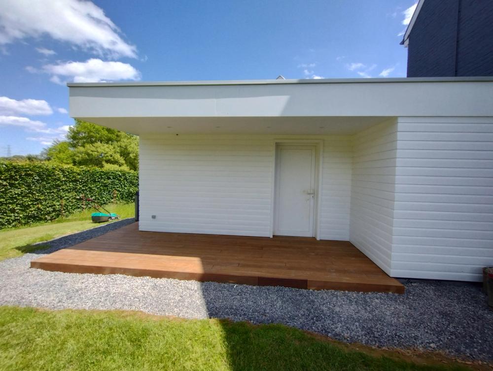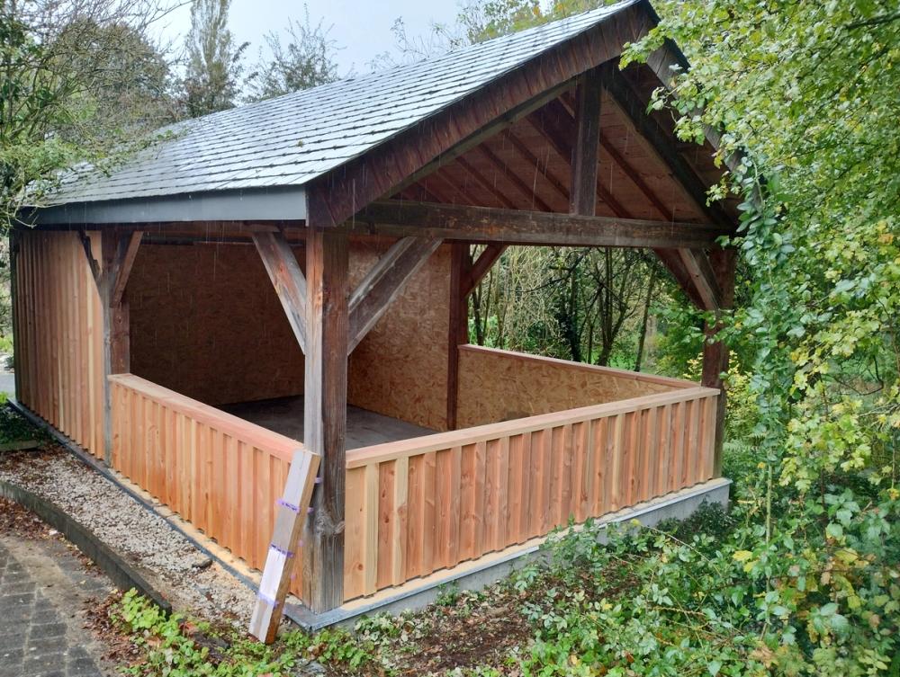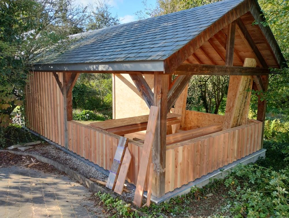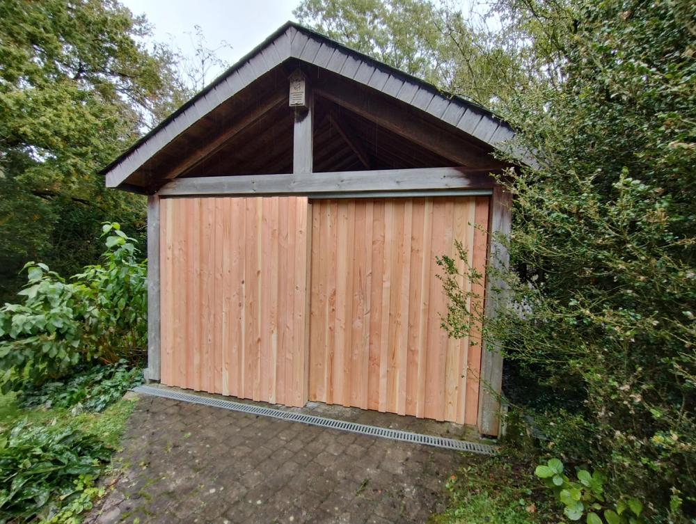 Adaptation d'un carport en atelier ouvert sur le jardin: portes-coulissantes camouflées grâce au bardage en Douglas du pays.